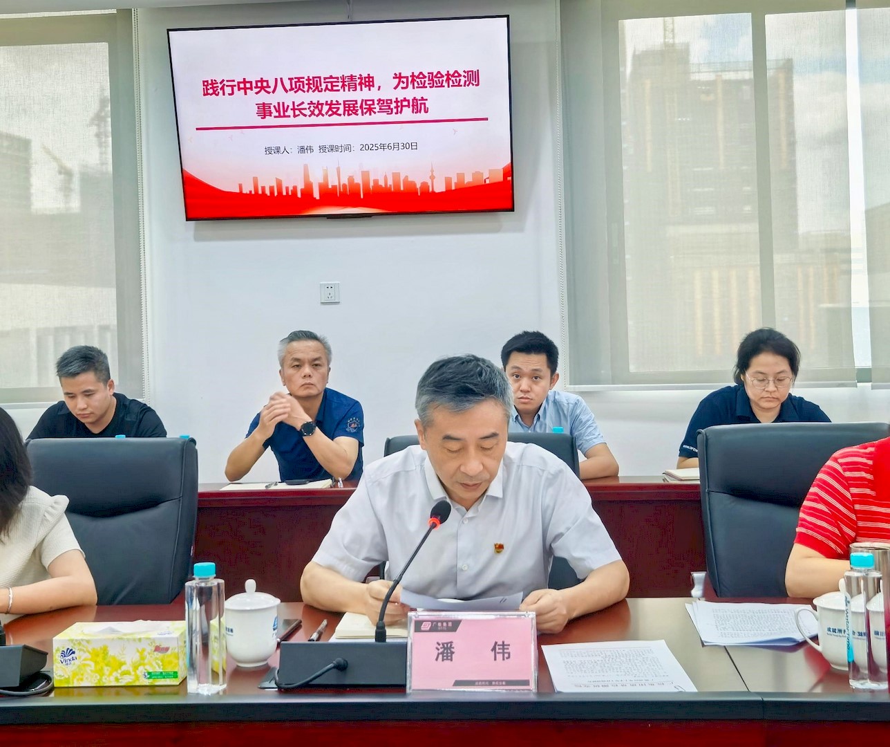 2025年6月30日下午,广检集团党委委员、副总经理潘伟赴广质开展基层调研工作,并为全体党员干部讲授专题党课,广质党总支班子成员、各党支部书记及中层以上干部(含部长助理)参加会议。