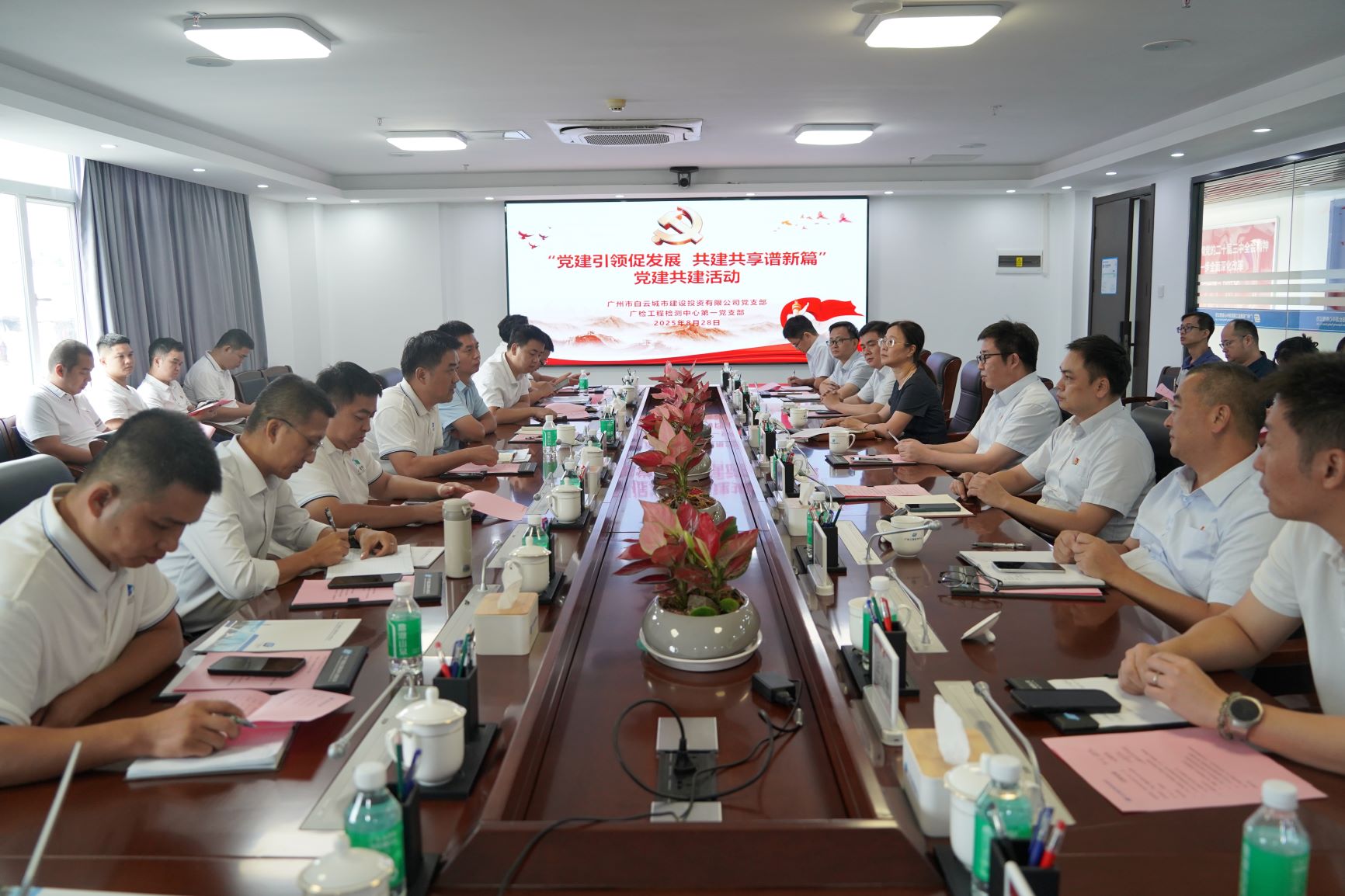 白云建设公司党支部书记、副总经理汪勇,副总经理王建涛,广检工程检测中心党总支书记、总经理毛吉化,党总支委员、副总经理罗创涟,党总支委员、第一党支部书记吴映华等领导出席活动,双方党员干部共计30余人参加。