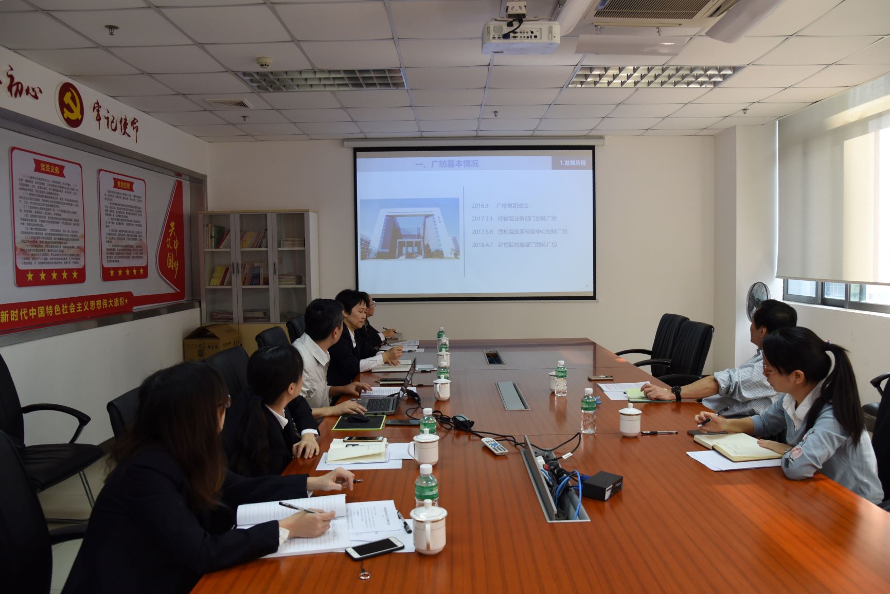2019年11月27日,广检集团临时党委副书记、董事王世基一行到广纺调研基层工作,广纺领导班子成员和相关部门人员接待调研。