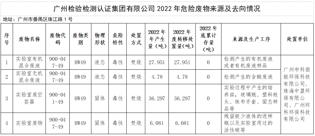 现将广州检验检测认证集团有限公司2022年危险废物污染环境防治产废处置信息公开如下: