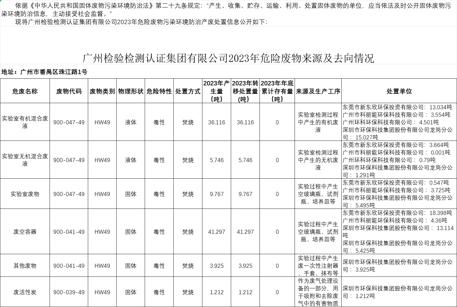 现拟将广州检验检测认证集团有限公司2023年危险废物污染环境防治产废处置信息在集团官网公开,具体见附件。