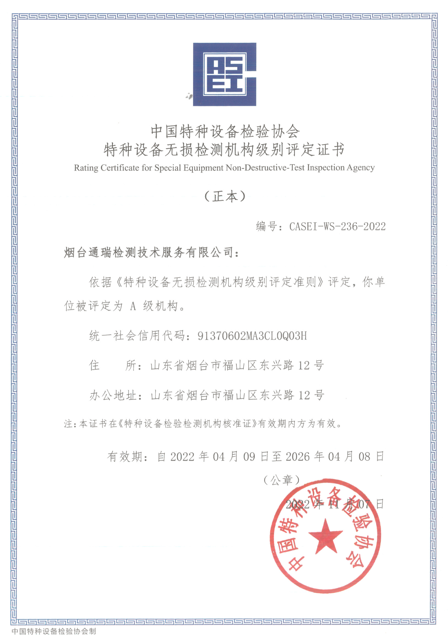 烟台通瑞公司特种设备A级证书