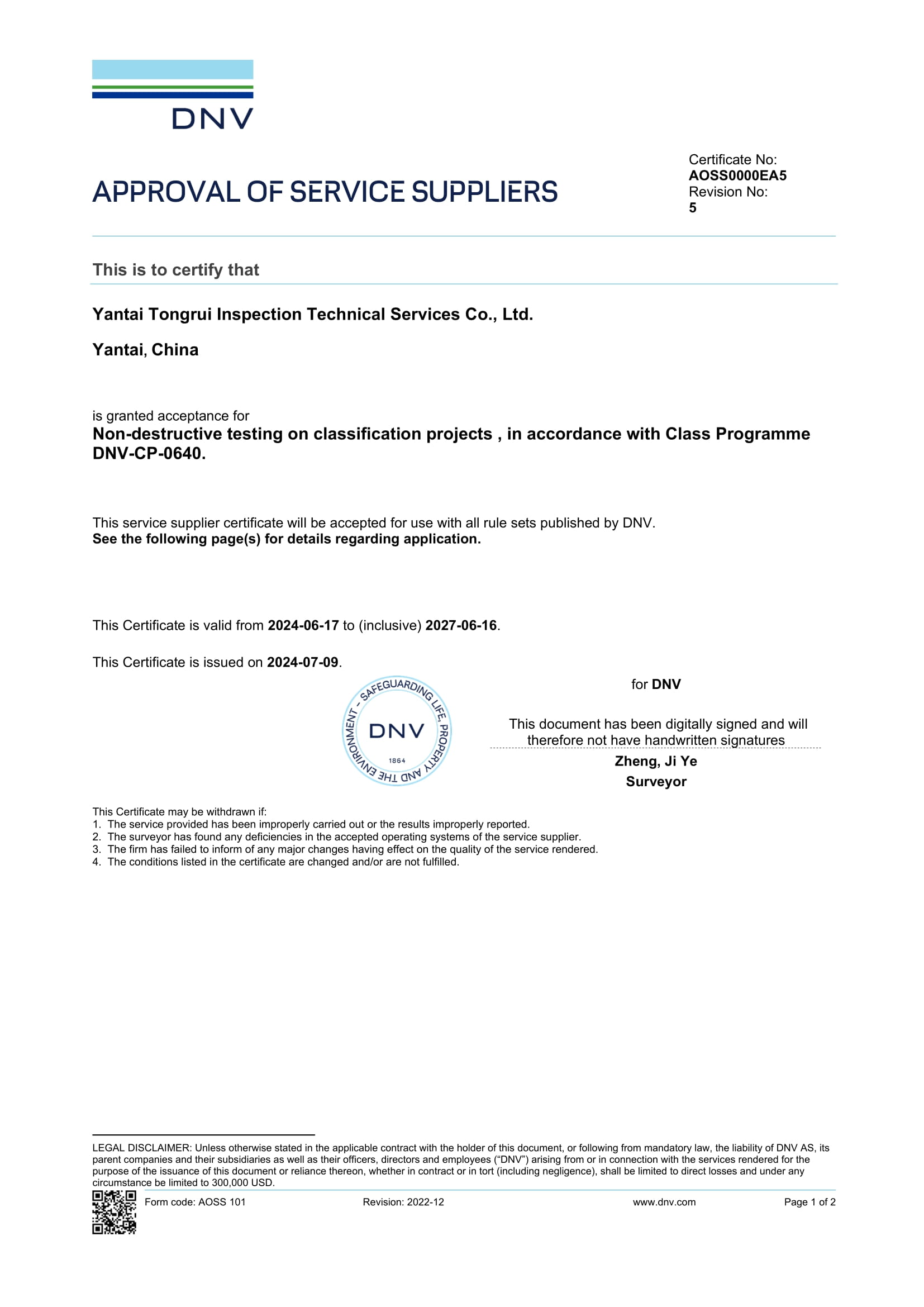 烟台通瑞公司DNV证书