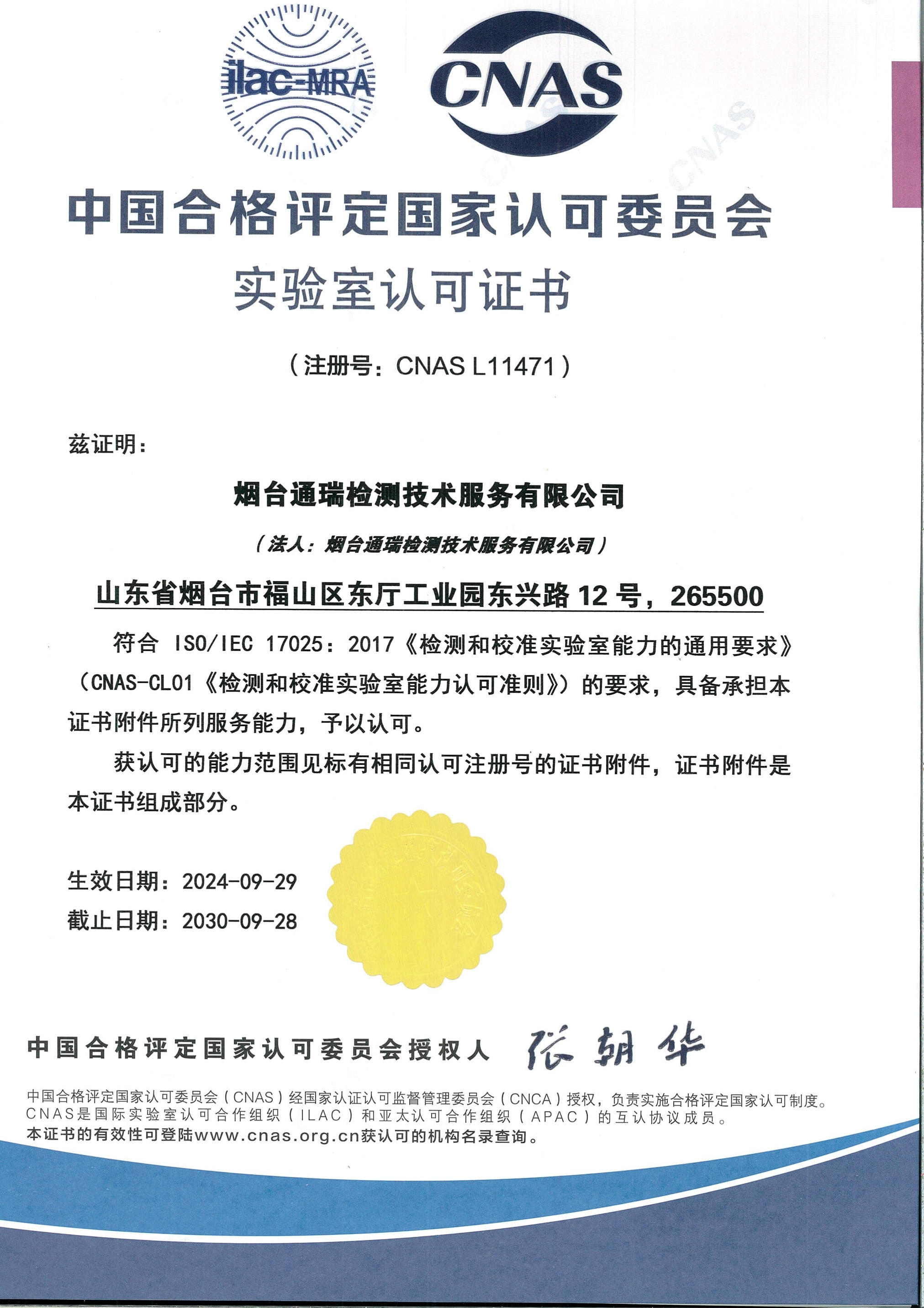 烟台通瑞公司CNAS 证书