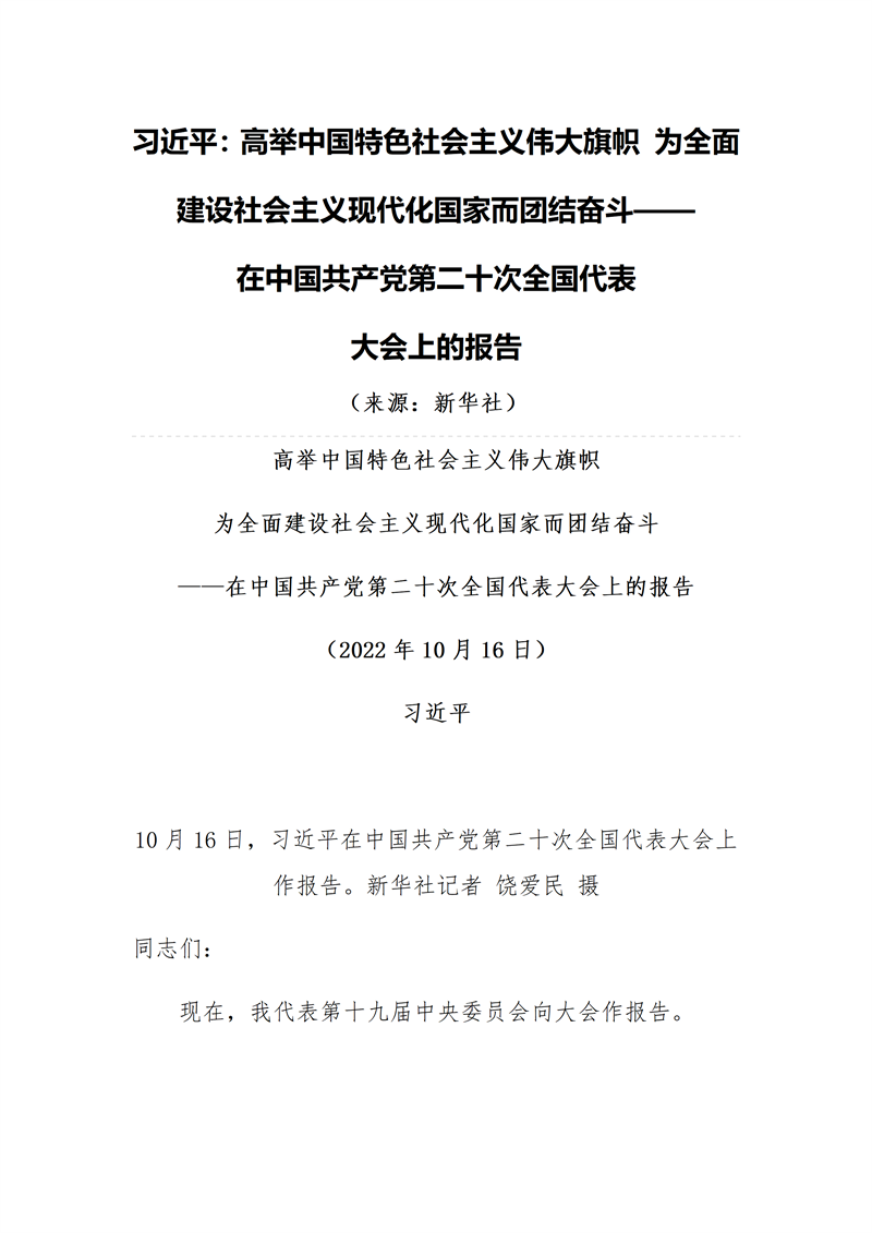 习近平:高举中国特色社会主义伟大旗帜 为全面建设社会主义现代化国家而团结奋斗——在中国共产党第二十次全国代表大会上的报告