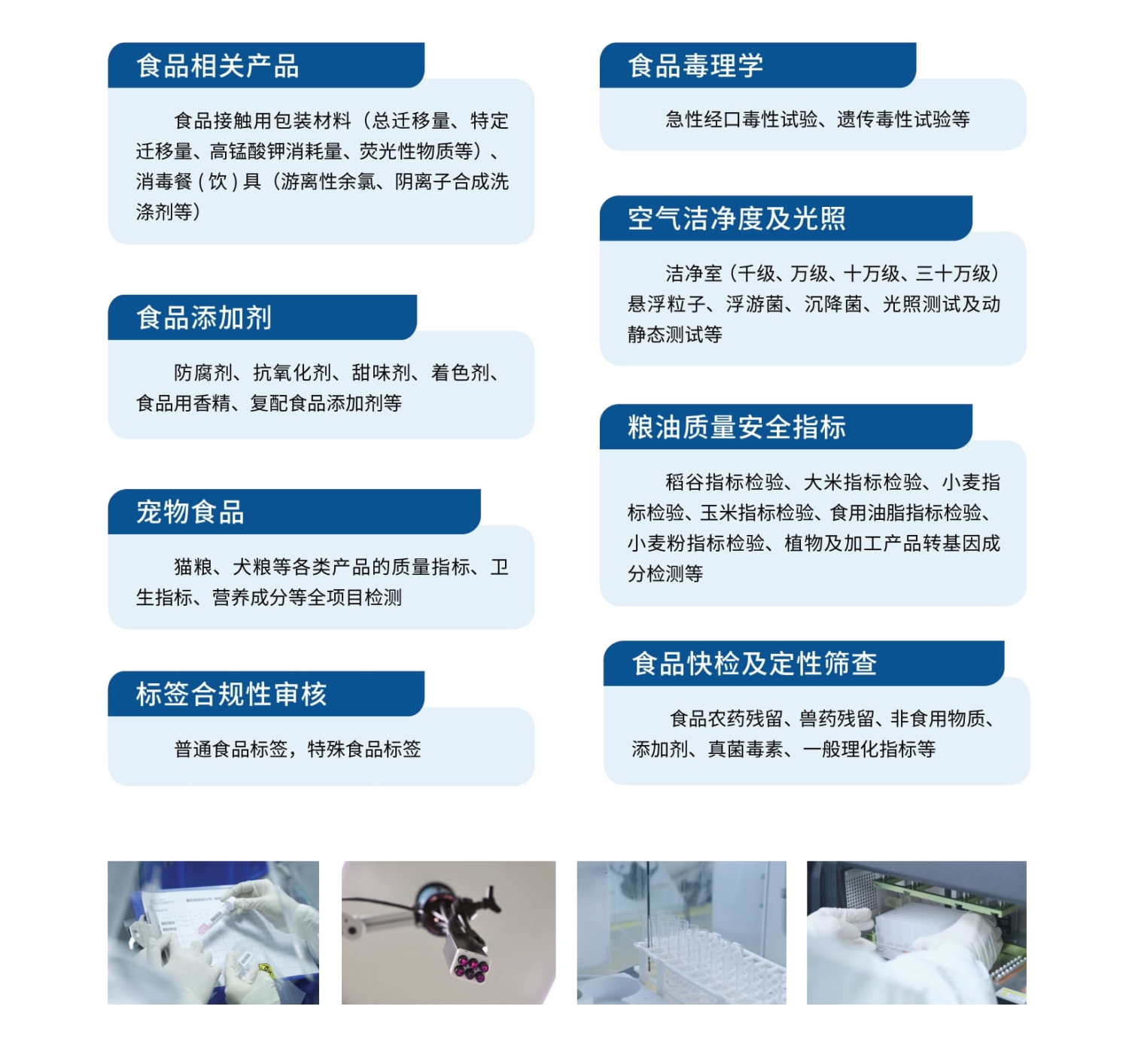 认可检验检测能力涵盖运动营养食品、婴幼儿配方食品、婴幼儿辅助食品、特殊医学用途配方食品、保健品等各类食品(含食品添加剂)、农副产品、宠物食品、饲料(含饲料添加剂)、食品包装材料、日化产品等品项及其原辅料、半成品、试制品等检验检测能力,为客户提供全方位的食品、食品相关产品及日化产品质检服务。