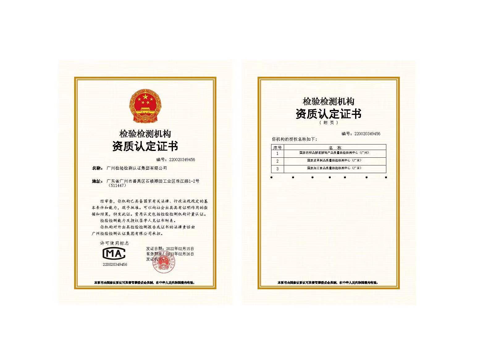 一、广州检验检测认证集团有限公司“一家一证”检验检测机构资质认定证书(编号:220020349456),授权有国家纺织品服装服饰产品质量检验检测中心(广州)、国家皮革制品质量检验检测中心(广东)、国家加工食品质量检验检测中心(广东)三个国家质检中心,发证日期:2022年2月15日(见附件)。