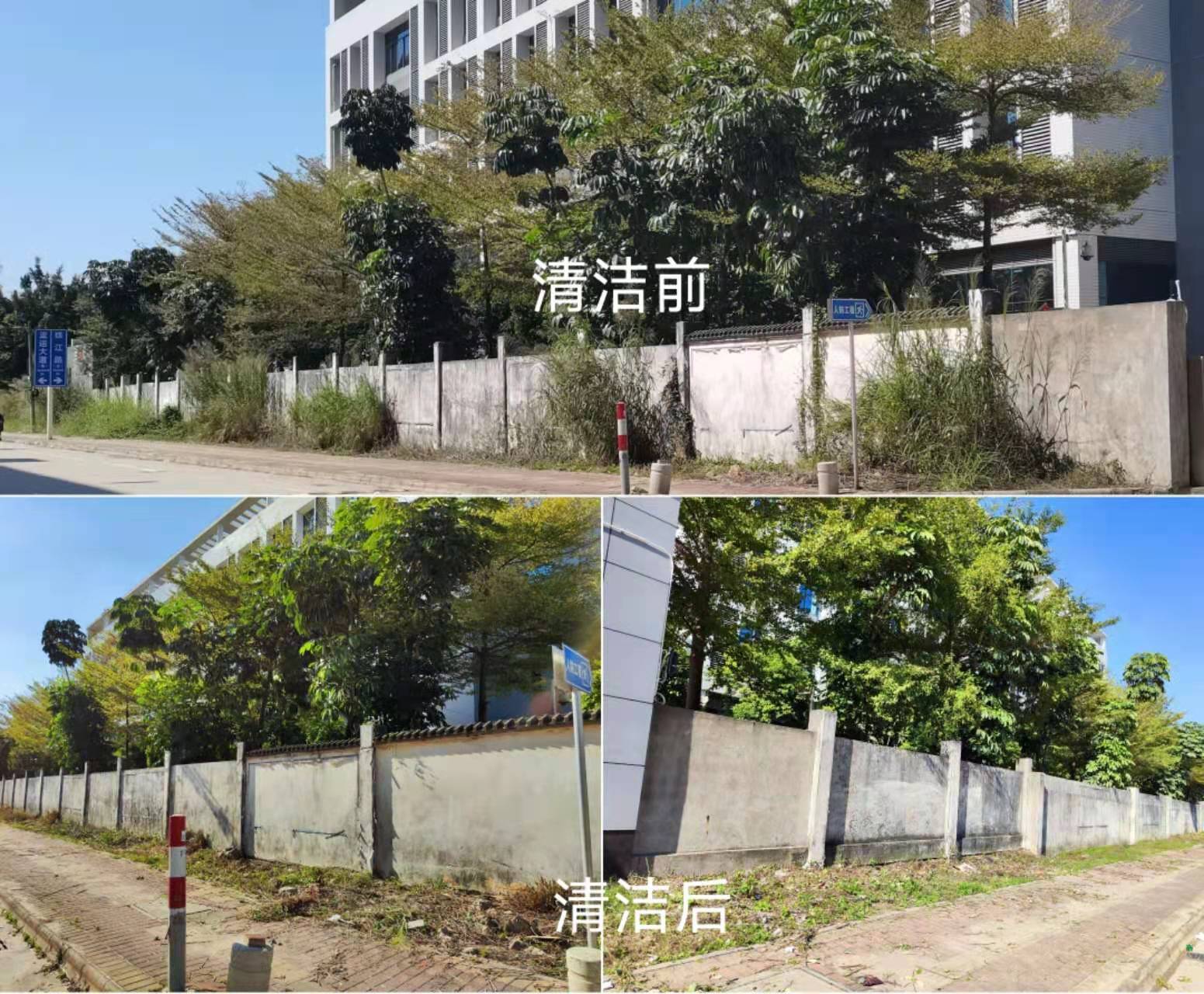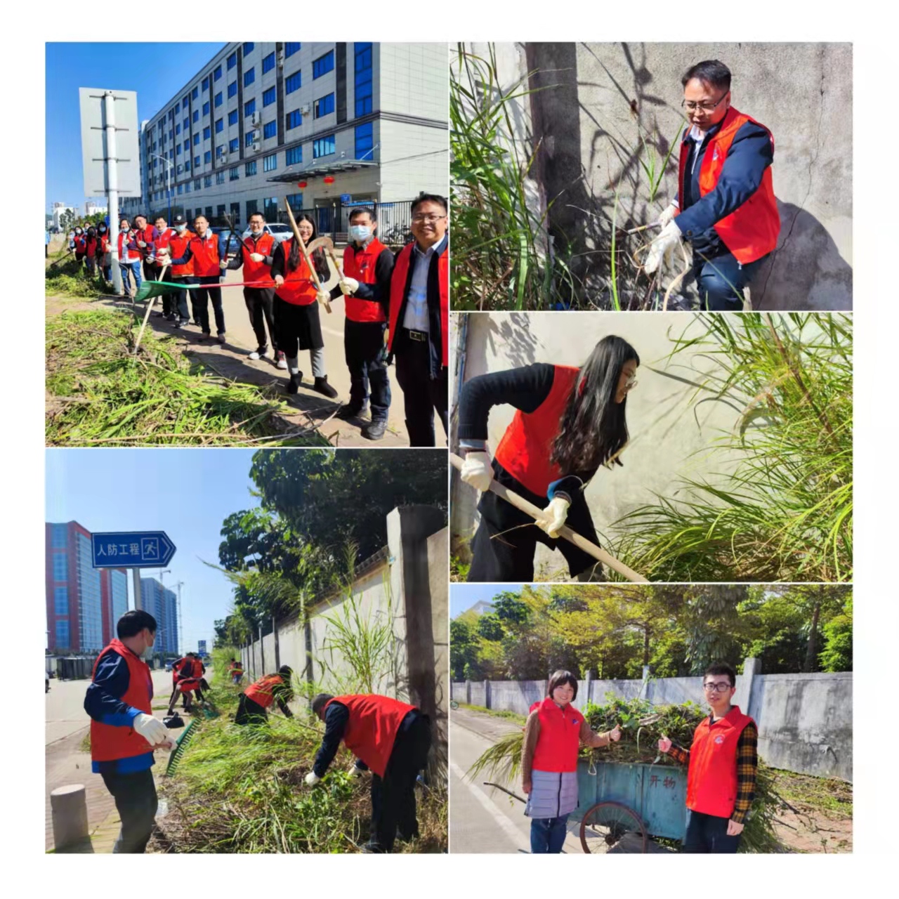 随后,志愿者们一字铺开、全面开动。有人挥舞锄头,有人收拢杂草,细密的汗珠和晒红的笑脸成为南门一道靓丽的风景线。一个多小时后,两侧杂草被清理干净,园区南门大道显得更加开阔整洁。