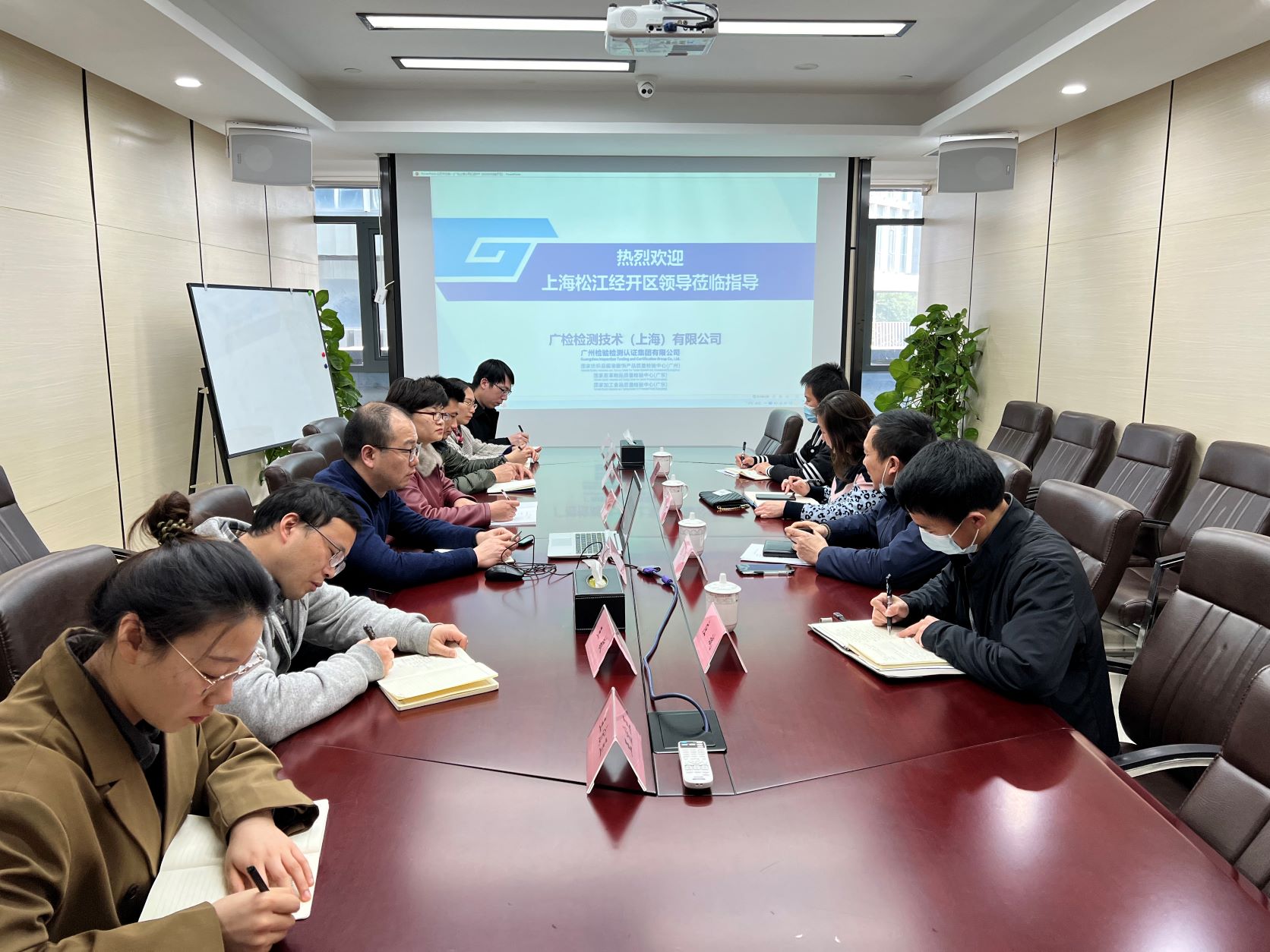 座谈中,松江经开区四位领导听取了上海公司负责人马良就广检上海公司关于党建引领、经营情况、未来规划及疫情防控的详细汇报。
