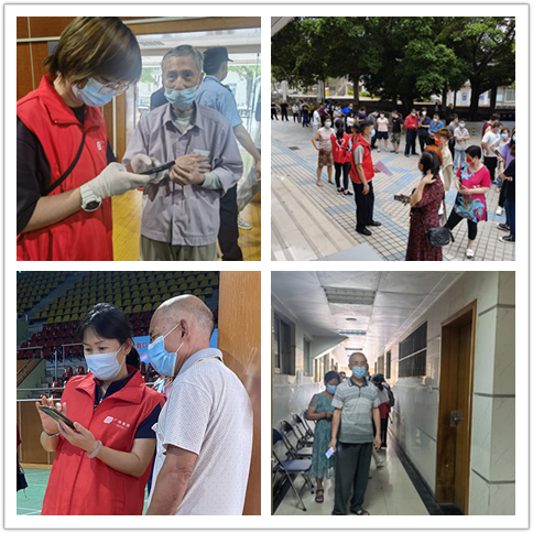 在海珠区体育馆支援现场,老年人居多,信息录入时听不懂有些地方方言,广检集团党员徐小乔就用熟络的粤语和用自己的身份证模拟引导现场群众录入检测信息。有一位老人独自前来核酸检测,只带了老人机,无法录入信息且没有带身份证,记不住身份证号,他很着急,“您不要着急,您还记得您家人的电话号码吗,我们打电话和您家人联系下。”徐小乔耐心安抚道,引导他一边给家人开免提打电话,一边用她的手机帮助录入信息,并耐心细致引导这位老人完成核酸检测。结束后老人非常感激的说道:“小姑娘,真是太谢谢你了,家里年轻人都在外地,不然老头子我都不晓得今天怎么办哦!”“您不用谢,我应该做的,我家里父母也跟您一样,以后有什么事或需要帮助的可以找党员或社区帮忙。”徐小乔说完便继续投入到服务岗位当中。