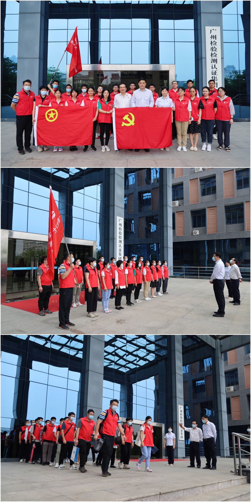 5月7日,广检集团按照支援番禺区全员核酸检测任务安排,集团党委第一时间动员部署“质量卫士”突击队“组团式”对口支援番禺区石楼镇全员核酸检测点。下午13:45分,20名集团“质量卫士”志愿者集结完毕,广检集团党委书记、董事长蔡依军,集团党委副书记、董事王世基分别为出征队伍作动员讲话和授旗,并向全体突击队员表示慰问,激励全体突击队员持续发扬特别讲政治、特别能奉献、特别能战斗的精神,以党旗为引,全力以赴、齐心抗“疫”,为助力广州基层疫情防控一线贡献“广检力量”。