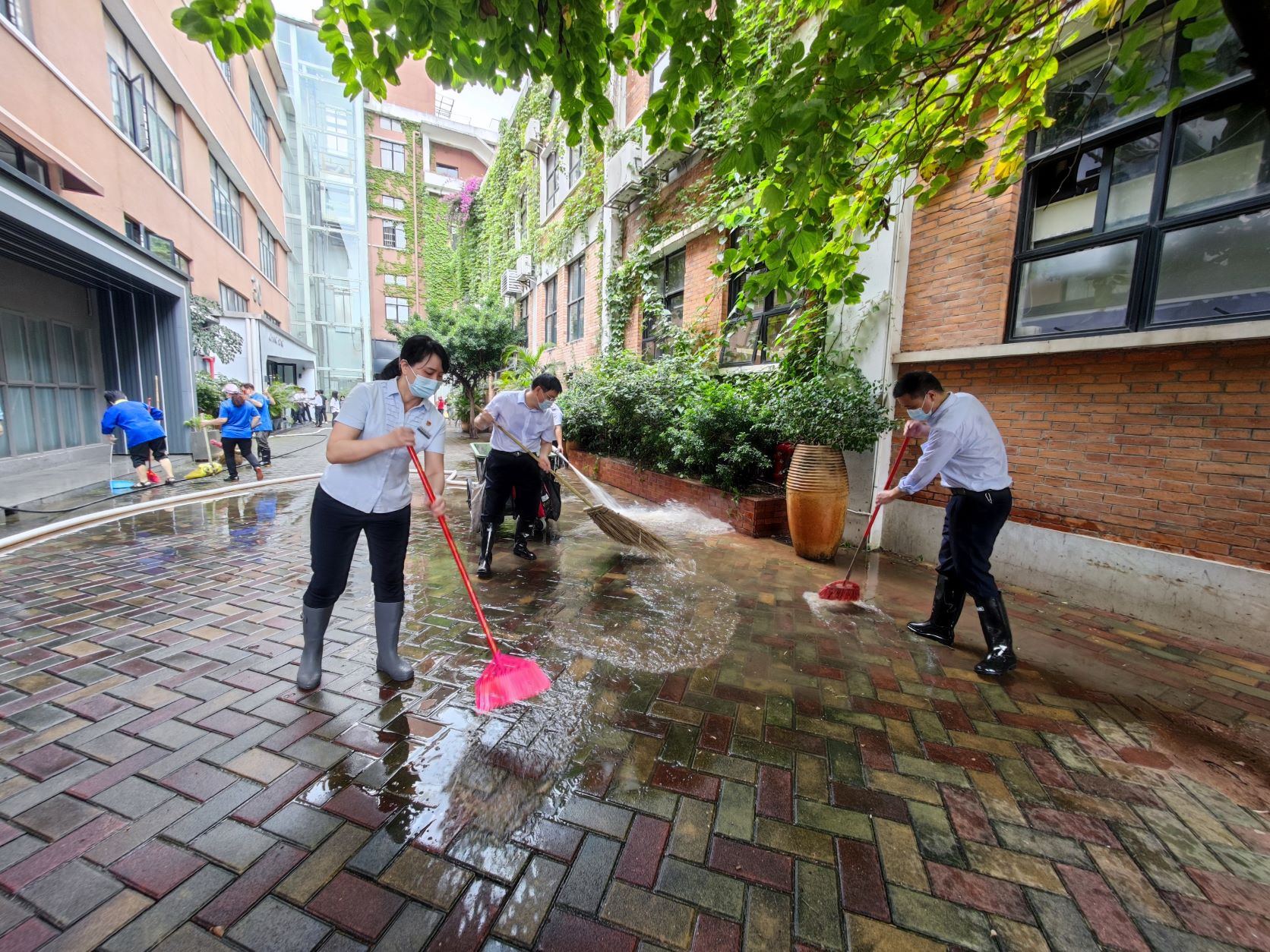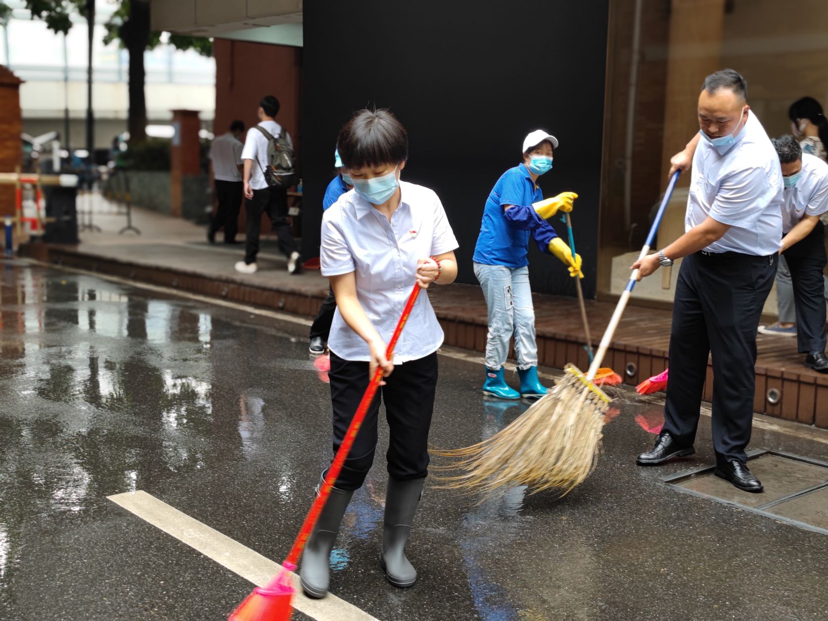 园区负责人黄旭敏(左一)带领党员冲洗30号楼路面