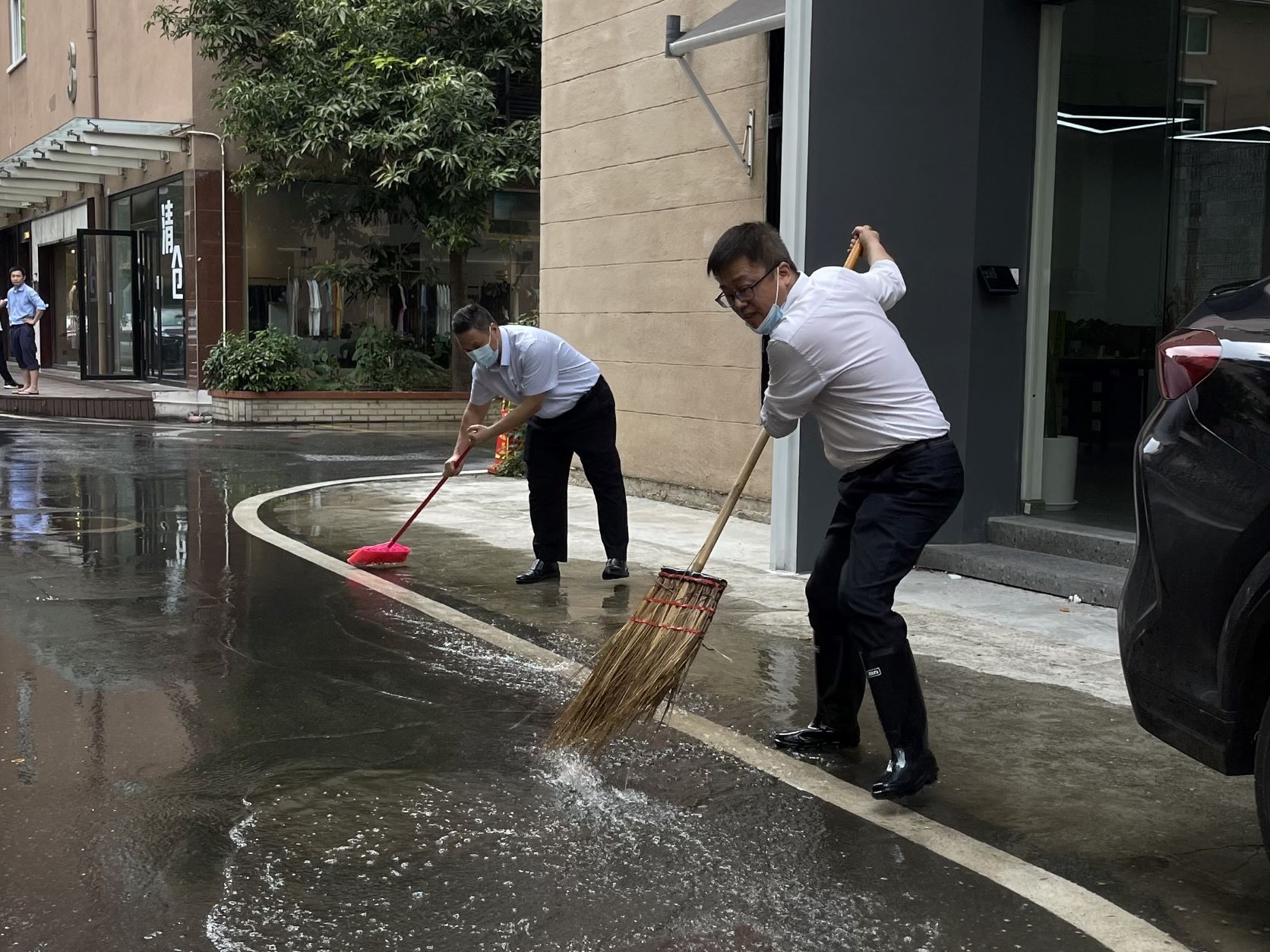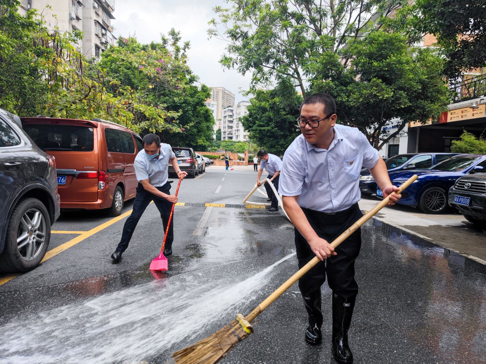 党总支委员唐湛生(左一)和工作人员冲洗路面
