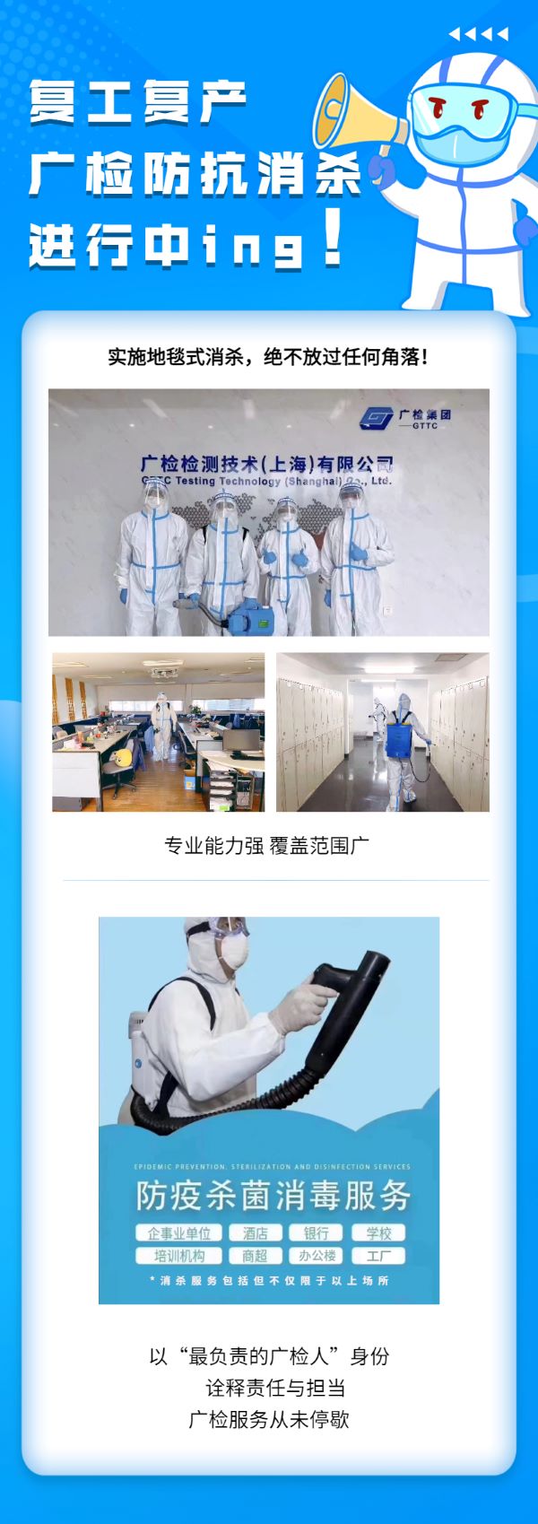 战“疫”一线,全力以“复”。根据上海市复工复产疫情防控指引,广检上海助力解决各企事业、学校、商超等复工复产防疫消杀的迫切需求,全面升级复工复产专项消毒杀菌服务,配备专业高素质团队开展公共环境消毒杀菌工作,切实保障各行各业复工复产的环境安全。