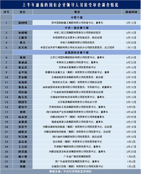 上半年通报的国有企业领导人员接受审查调查情况